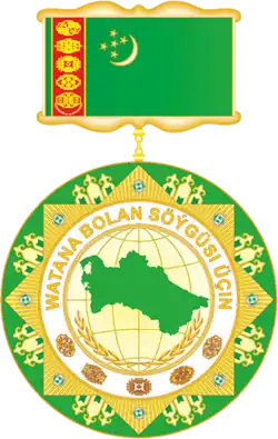 Медаль, представляет собой круг золотистого цвета, снизу обременённый двумя лавровыми ветвями зелёной эмали с выступающими за край круга листьями. В центре круга контурная карта Туркмении зелёной эмали с расходящимися к краю круга солнечными лучами, поверх которой золотой профильный портрет первого президента Туркмении Сапармурата Ниязова. По верхнему краю круга выпуклыми буквами надпись: «WATANA BOLAN SÖÝGÜSI ÜÇIN».
