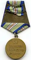 Медаль при помощи ушка и кольца соединяется с пятиугольной колодкой, обтянутой шёлковой муаровой лентой оливкового цвета шириной 24 мм. В середине ленты две белые полоски шириной 2 мм, разделённые оливковой полоской такой же ширины. По краям ленты синие полоски шириной 2,5 мм каждая.