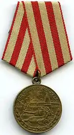 Медаль при помощи ушка и кольца соединяется с пятиугольной колодкой, обтянутой шёлковой муаровой лентой шириной 24 мм. На ленте три продольные оливковые полоски шириной 5 мм каждая и две красные полоски шириной 4 мм каждая. Края ленты окантованы узкими красными полосками.