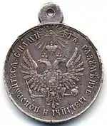 Диаметр медали 29 мм, известны также варианты диаметром 26 мм. Металл — серебро. На лицевой стороне изображён герб Российской империи, увенчанный небольшим изображением сияющим всевидящем оком. Вдоль бортика по кругу, начиная с середины левой верхней четверти круга медали, надпись на церковнославянском: «С НАМИ Б҃ГЪ. РАЗУМѢЙТЕ ꙖЗЫЦЫ И ПОКОРѦЙТЕСѦ». На оборотной стороне медали надпись горизонтально в шесть строк[3][5]:
