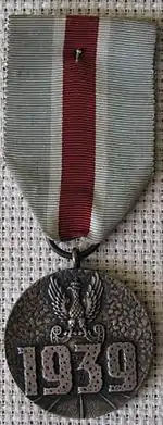 На лицевой стороне медали в центральной её части сделана надпись стилизованными цифрами: «1939». Цифры иссечены пулями. В верхней части помещено изображение коронованного орла, держащего в когтях щит амазонок (эмблема польской армии, носимая на головном уборе). Часть щита прикрыта цифрами. В нижней части медали изображены сходящиеся к центру узкие лучи, разделенные более широкими лучами на шесть секторов.