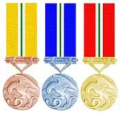 - для бронзовой медали — жёлтая лента, в центре которой широкая белая полоса, разделённая узкой зелёной полоской.
