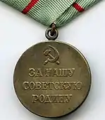 На оборотной стороне медали отчеканена надпись «ЗА НАШУ СОВЕТСКУЮ РОДИНУ» в три строки, над которой расположено изображение серпа и молота.