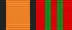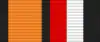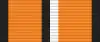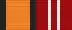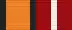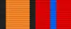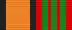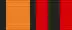 Медаль при помощи ушка и кольца соединяется с пятиугольной колодкой, обтянутой шёлковой муаровой лентой шириной 24 мм. С правого края ленты оранжевая полоса шириной 8 мм, окаймлена двумя чёрными полосами шириной 2 мм, левее — равновеликие, красная, белая и чёрная полосы.