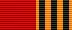 Медаль при помощи ушка и кольца соединяется с пятиугольной колодкой, обтянутой шёлковой муаровой лентой. Ширина ленты 24 мм. Левая половина ленты красного цвета. На правой половине ленты — пять продольных равных по ширине чередующихся полос: три чёрного и две оранжевого цвета и по краям — по одной узкой оранжевой полосе шириной 1 мм.