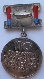 | Кому вручается | учителя, воспитатели, старшие пионервожатые, руководители школ, педагогические работники внешкольных и дошкольных учреждений, органов народного просвещения, работники педагогических наук | ||