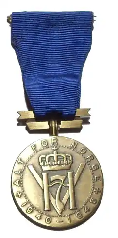 Аверс несёт на себе коронованную монограмму Хокона VII, наложенную на букву «V» (victory – победа). Монограмма окружена кругом из точек, отделяющих кайму, на которой две надписи, разделённые крестами: вверху – «ALT FOR NORGE», внизу – «1940-1945».