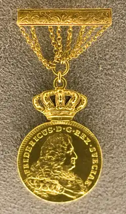 Аверс медали несёт на себе погрудное профильное изображение короля Фредрика I. По краю медали по окружности королевская легенда на латыни: «FREDERICUS • D • G • REX • SUECIAE» (Фредрик Божьей милостью король Швеции).