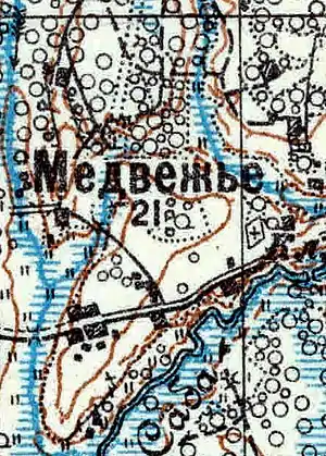 МЕДВЕЖКИ — деревня принадлежит штабс-капитану Конисскому, число жителей по ревизии: 7 м. п., 9 ж. п.[6] (1838 год)