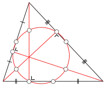 - Треугольник делится тремя медианами на шесть равновеликих треугольников. Центры описанных окружностей этих шести треугольников лежат на одной окружности, которая называется окружностью Ламуна.