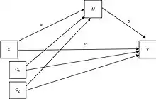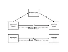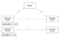 Прямой эффект измеряет степень изменения зависимой переменной, когда независимая переменная увеличивается на единицу, а переменная-медиатор остается неизменной. Напротив, косвенный эффект измеряет степень изменения зависимой переменной, когда независимая переменная остается фиксированной, а переменная-медиатор изменяется на величину, на которую она бы изменилась, если бы независимая переменная увеличилась на одно значение[2]. Косвенный эффект характеризует степень, в которой переменная X влияет на переменную Y через медиатора. На диаграмме косвенный эффект представляет собой произведение коэффициентов и . Прямым эффектом является коэффициент . В линейных системах суммарный эффект равен сумме прямого и косвенного ( на диаграмме). В нелинейных моделях общий эффект обычно не равен сумме прямых и косвенных эффектов, а представляет собой модифицированную комбинацию этих двух эффектов[3].