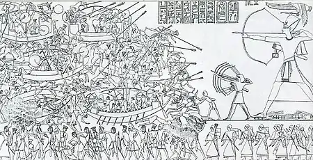 Настенные барельефы храма Рамсеса III в Мединет-Абу изображают выдающиеся достижения покойного фараона, в том числе одержанную им военную победу над вторгшимися около 1180 г. до н. э. в Дельту полчищами «народов моря».