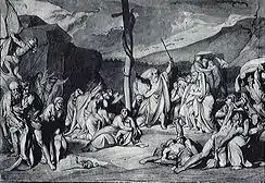 В качестве сюжета для картины Бруни использовал историю, описанную в Ветхом Завете[4] — о том, как после многих лет странствий по каменистой пустыне, иудейский народ, ведомый из Египта пророком Моисеем, стал терять веру и роптать, в результате чего последовало Божье наказание — дождь из ядовитых змей, для спасения от смертельных укусов которых был выставлен медный змий[5][6].