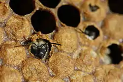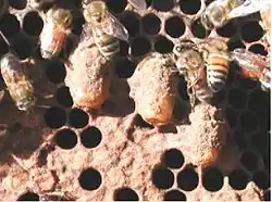 Рабочие пчёлы выкармливают и выращивают всё молодое поколение семьи. Если развивающуюся из оплодотворённого яйца личинку до запечатывания ячейки пчёлы кормят только высокопитательным молочком, выделяемым аллотрофическими железами (видоизменёнными верхнечелюстными слюнными железами),[19] то из неё вырастает матка. Если же личинку после трёх дней её жизни начинают кормить мёдом и пергой (белковый корм, приготовленный из пыльцы растений), то из личинки развивается рабочая пчела.