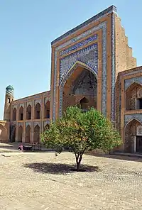 Главный фасад медресе Мухаммада Рахим-хана отделяется от улицы внешним двориком, обнесённый глухой стеной снаружи и окруженный одноэтажными купольными худжрами внутри.
