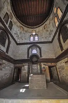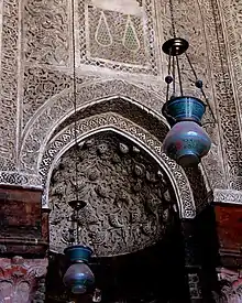 Медресе ан-Насира Мухаммада — одно из трёх медресе в Каире, где размещались все четыре суннитские школы права[4]. Медресе включает последний стукковый михраб (нишу, указывающую направление молитвы) в Египте, уникальный своими приподнятыми яйцевидными лепными выступами в горельефе с перфорированным орнаментом, украшающим козырёк михраба[4]. Этот стиль очень напоминает лепнину, изготовляемую в иранском Тебризе при монгольском правлении Ильханидов, и историки предполагают, что она была создана мастерами из монгольского Ирана или Тебриза[2][3][5]. Кроме михраба, в целом в интерьере здания сохранилось сравнительно мало украшений[3].