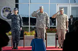 Церемония закрытия Межвидового командования ВС США. Слева направо: адмирал Майк Муллен, генерал Рэймонд Одиерно, сержант-майор Брайан Баттаглия
