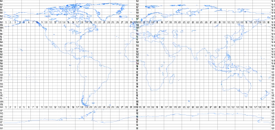 - § 4-b. По обе стороны от экватора до. 88° широты широтные 4-градусные зоны обозначаются латинскими буквами от A до V. Окружности вокруг полюсов, ограниченные 88° широты, обозначаются буквой Z. Колонки по 6° долготы номеруются от 1 до 60 с запада на восток, начиная с меридиана 180° от Гринвича.