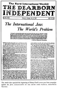 В 1918 году Форд приобрёл еженедельную газету «Дирборн индепендент» (англ. The Dearborn Independent), в которой с 22 мая 1920 года на протяжении 91 номера[5] публиковались антисемитские статьи, а также по частям полный текст Протоколов сионских мудрецов. В ноябре 1920 года подборка статей из «Дирборн индепендент» была опубликована отдельной книгой под названием «Международное еврейство. Исходная мировая проблема» (англ. The International Jew: The World's Foremost Problem) из 20 глав[6]. Основную часть первого тома составили компиляции «Протоколов». Материалы для «Дирборн индепендент» готовил Уильям Камерон (англ. William J. Cameron), возглавивший газету в 1920 году[5] .