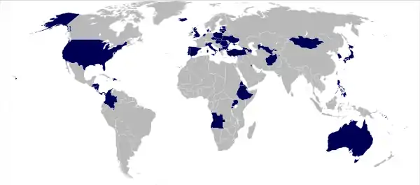 Австралия, Азербайджан, Албания, Ангола, Афганистан, Болгария, Великобритания, Венгрия, Гондурас, Грузия, Дания, Доминиканская Республика, Исландия, Испания, Италия, Колумбия, Коста-Рика, Южная Корея, Кувейт, Латвия, Литва, Маршалловы острова, Микронезия, Монголия, Нидерланды, Никарагуа, Палау, Панама, Польша, Португалия, Руанда, Румыния, Сальвадор, Северная Македония, Сингапур, Словакия, Соломоновы острова, США, Тонга, Турция, Уганда, Узбекистан, Украина, Филиппины, Чехия, Эритрея, Эстония, Эфиопия, Япония, Казахстан.