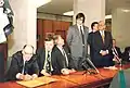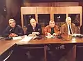 Пресс-конференция Леонардо-клуба. Слева направо: Владимир Маслаченко, Александр Яковлев, Аркадий Вайнер, Василий Смыслов (Москва, пресс-центр МИД РФ, 1994).