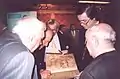 На Предолимпийском блиц-турнире (Москва, 1992) с участием Г. Каспарова, В. Смыслова, М. Таля. Слева на сцене — действительный член Леонардо-клуба Аркадий Вайнер.