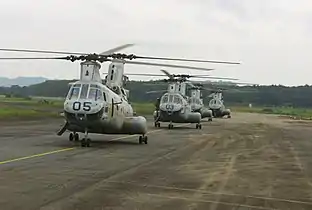 Вертолеты CH-46 Sea Knight с морскими пехотинцами США в международном аэропорту Робертса во время второй гражданской войны в Либерии. Август 2004