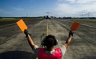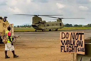 Сотрудник аэропорта наблюдает за вертолётом Ch-47F Chinook. 10 декабря 2014