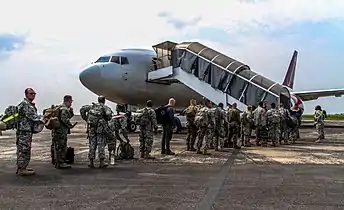Военнослужащие США, участвовавшие в миссии, направленной на борьбу с эпидемией вируса Эбола, в ожидании перед вылетом. 1 января 2015