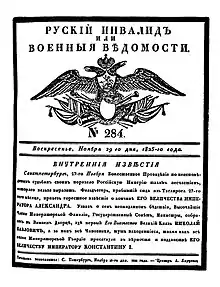 6 (18) декабря по распоряжению министра финансов, графа Е. Ф. Канкрина на монетном дворе начали чеканить пробные рубли с профилем нового императора и надписью «Б. М. КОНСТАНТИНЪ I ИМП. И САМ. ВСЕРОСС»[~ 2]. Типографии приступили к печатанию портретов нового российского императора, приказов, паспортов и других государственных документов с печатными заголовками «…по указу императора Константина Павловича»[~ 3].