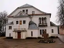 - Старинный каменный крест перед зданием усадьбы.