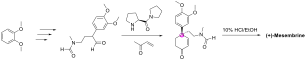 Первый полный синтез мезембрина был предложен в 1965 году[8]. Этот способ состоит из 21 шага, что является одним из самых длинных путей синтеза мезембрина.