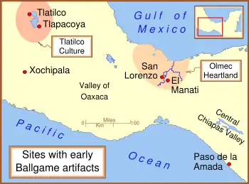 Из тропических низменностей игра, очевидно, распространилась в центральную Мексику. Начиная с 1000 года до н. э. статуэтки игроков клались в захоронения в Татилько и около поселения Тлапакоя. Однако найти стадионы для игры в мяч в этих местах не удалось.