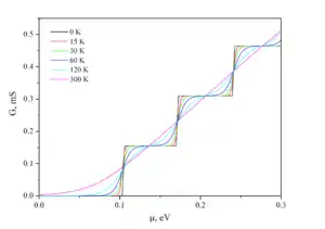 где N — это число поперечных мод в микросужении. При повышении температуры наблюдается размытие ступеней в связи с уширением распределения Ферми — Дирака.
