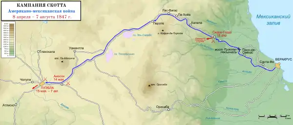 Мексиканская кампания Скотта, или поход Скотта на Мехико (англ. Scott's Mexico City campaign), — военная кампания под руководством американского генерала Уинфилда Скотта в 1847 году во время американо-мексиканской войны. Намереваясь принудить мексиканское правительство к миру, Скотт высадился около Веракруса, захватил этот город и начал наступление на столицу Мексики, следуя по пути похода Эрнана Кортеса (1519). Разбив мексиканскую армию при Серро-Гордо и Чурубуско, Скотт подступил к Мехико и в ходе нескольких сражений овладел городом. Падение Мехико и несколько последующих сражений вынудили мексиканское правительство пойти на переговоры и заключить договор Гуадалупе-Идальго. Военные историки считают кампанию Скотта важным этапом в развитии американского военного дела и шедевром военного искусства своего времени[3]: имея всего 10 тысяч человек и будучи почти без резервов, он разбил вдвое превосходящие его силы и за шесть месяцев закончил кампанию.