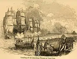 На рассвете 9 марта около 5000 человек были размещены на фрегатах Raritan и Potomac. В 11:00 был отдан приказ о выдвижении, в 13:00 флот прибыл к острову Сакрифисиос и встал на якорь. По сигналу с «Массачусетса» начала десантирование регулярная дивизия генерала Уорта. Солдат разместили на 65 десантных кораблях, по 50—80 человек на каждый. На берегу были заметны передвижения противника: было видно около трёх сотен кавалерии, и предполагалось присутствие орудий. Кавалерию отогнали огнём корабельных орудий. Генерал Уорт первым ступил на берег, и вскоре его дивизия заняла первую цепь дюн. Корабли вернулись за второй партией десанта — дивизиями Паттерсона и Твиггса. К полуночи все 10 000 человек были высажены на берег без единого инцидента[18].