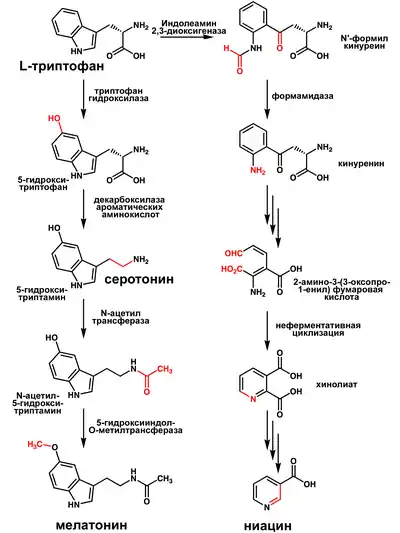 В организме человека мелатонин синтезируется из аминокислоты триптофана, которая участвует в синтезе нейромедиатора (нейропередатчика) серотонина, а он, в свою очередь, под воздействием фермента N-ацетилтрансферазы превращается в мелатонин. Мелатонин является индольным производным серотонина и синтезируется ферментами N-ацетилтрансферазой и гидроксииндол-О-метилтрансферазой.