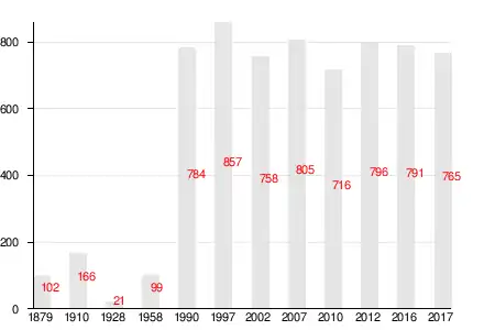 Число жителей по семейным спискам 1879 г.: 40 м. п., 59 ж. п.; по приходским сведениям 1879 г.: 46 м. п., 71 ж. п.