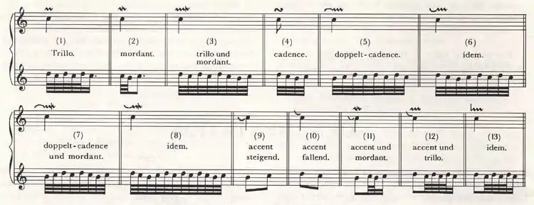 Учебная таблица расшифровки украшений (мелизмов), составленная И. С. Бахом для В. Ф. Баха («Клавирная книжечка В. Ф. Баха», 1720)[4]