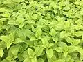 Листья супротивные, черешковые, яйцевидные до закруглённо-ромбических, городчато-пильчатые, опушённые.