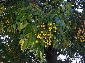 Плоды — сочные светло-жёлтые шаровидные костянки, остающиеся на дереве всю зиму.