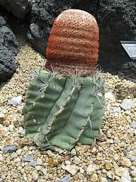 Мелокактус, или Дынный кактус[2] (лат. Melocactus) — род кактусов, образующих одиночные стебли средних размеров от сдавленно-шаровидной до коротко-цилиндрической формы с хорошо выраженными широкими и высокими рёбрами и крепкими шиловидными, прямыми или изогнутыми, колючками. Широко распространённые на Антильских островах стали, по-видимому, первыми крупными шаровидными кактусами, с которыми познакомились европейцы при открытии Америки. Встречаются на территории Мексики, стран Центральной Америки, Венесуэле, Колумбии, Эквадоре, Перу, Бразилии.