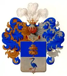 Щит перистый. В первой, лазурной части, золотой дуб, на вершине которого серебряный голубь. Во второй, серебряной части, лазурный с чёрными клювом и лапами журавль, держащий золотой камень. Щит увенчан дворянскими шлемом и короною. Нашлемник: три серебряных страусовых пера. Намёт: справа — лазурный с золотом, слева — лазурный с серебром[1].