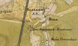 МЕЛЬНИЦА — деревня принадлежит Евдокимовой, подполковнице, при ней мельница мукомольная деревянная, число жителей по ревизии: 22 м. п., 29 ж. п. (1838 год)[3]