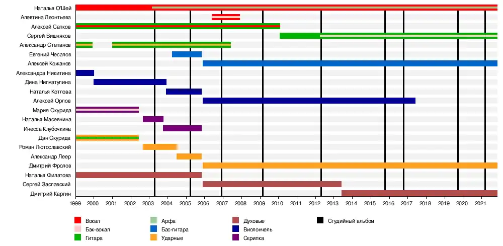 - Алексей Орлов — электровиолончель, виолончель, мандолина, аранжировки. С декабря 2005 года по июнь 2017 года.