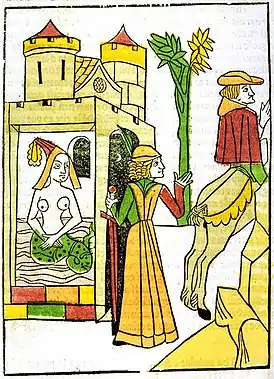 ![]() Миниатюра из рукописи «Роман о Мелюзине» Жильбера де Меца, около 1410 г. | |