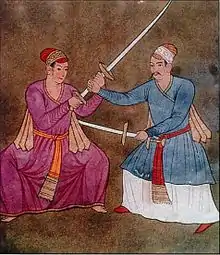 ![]() Обучение бою на мел путтах бемох. Иллюстрация из трактата «Ниханг-нама», Ахмеднагар, XVI век. |