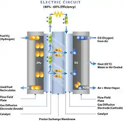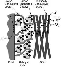 ПОМ зажата между двумя электродами, в которые встроен катализатор. Электроды (анод и катод соответственно) электрически изолированы друг от друга протонообменной мембраной. ПОМ обычно представляет собой проницаемый для протонов электрический изолирующий барьер из полимера перфторсульфоновой кислоты (ПФСК). (В настоящее время разрабатываются углеводородные варианты, которые, как ожидается, придут на смену ПФСК). Этот барьер позволяет протонам переходить от анода к катоду через мембрану, но заставляет электроны перемещаться по проводящему пути к катоду. Электроды прижимаются к ПОМ горячей прессовкой. Обычно используемые материалы для этих электродов - углеродная ткань или бумага из углеродного волокна.[3] Компания NuVant производит углеродную ткань под названием ELAT, которая максимизирует транспортировку газа к ПОM, а также отводит от мембраны водяной пар. Введение в ELAT катализатора из благородных металлов позволяет этой углеродной ткани также действовать как электрод. Существуют и другие технологи изготовления АОМ. Платина является одним из наиболее часто используемых катализаторов, однако используются и другие металлы платиновой группы. Рутений и платина часто используются вместе, если продуктом электрохимической реакции является окись углерода (CO), поскольку CO загрязняет ПОМ и влияет на эффективность топливного элемента. Из-за высокой стоимости этих и подобных материалов проводятся исследования по разработке катализаторов, в которых используются более дешевые материалы, поскольку высокая стоимость по-прежнему является препятствием для широкого экономического признания технологии топливных элементов. Текущий срок службы составляет 7300 часов в циклических условиях, при одновременном снижении нагрузки металла платиновой группы до 0,2 мг / см 2.[4]