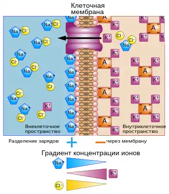 Различия в концентрациях ионов с разных сторон клеточной мембраны вызывают возникновение напряжения, называемого мембранным потенциалом. Типичные значения мембранного потенциала находятся в диапазоне от −40 мВ до −80 мВ. Многие ионы образуют градиент концентрации на мембране, в том числе ионов калия (), имеющие высокую концентрацию внутри клетки и низкую вне клетки. Ионы натрия () и ионы хлора () имеют высокую концентрацию во внеклеточной области и низкую концентрацию во внутриклеточной области. Эти градиенты концентрации дают потенциальную энергию для возникновения мембранного потенциала. Это напряжение на мембране возникает когда мембрана проницаема для одного или нескольких типов ионов. В простейшем случае показанном на рисунке, если мембрана избирательно проницаема для ионов калия они могут диффундировать в сторону снижения концентрации на внешнюю сторону клетки, оставляя за собой нескомпенсированные отрицательные заряды. Это разделение зарядов и является причиной возникновения мембранного потенциала. Система в целом остаётся электронейтральной. Некомпенсированные положительные заряды вне клетки и нескомпенсированные отрицательные заряды внутри клетки физически располагаются на поверхности мембраны и притягиваются друг к другу будучи разделёнными липидным двойным слоем. Таким образом, мембранный потенциал физически действует только в непосредственной близости от мембраны. Именно разделение этих зарядов на мембране является основой возникновения электрического напряжения на мембране. Изображённая схема упрощённо показывает ионные вклады в мембранный потенциал. Другие ионы, включая ионы натрия, хлора, кальция и другие вносят несущественный вклад, даже если они имеют более высокие градиенты концентрации, потому что они имеют невысокую проницаемость через мембрану, чем ионы калия.