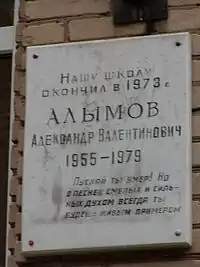 Мемориальная доска выпускнику школы № 6 Александру Валентиновичу Алымову (1955—1979) установлена в 1979 году на правой части фасада школы на доме № 13 по улице Гурьянова. Александр Алымов — советский военный лётчик, погибший в месте своей службы в Казахстане (в то время входившем в состав СССР). Отказавшись от катапультирования, ценой собственной жизни Алымов отвёл вышедший из строя и падающий самолёт от населённого пункта. В отличие от большинства подобных случаев в то время, подвиг Алымова — благодаря обнинской газете «Вперёд» — получил огласку в феврале 1979 года[1].